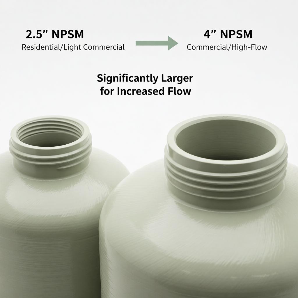 The Stark **4 NPSM pressure vessel** series is designed to meet the rigorous demands of high-volume commercial and industrial applications. As vessel diameter increases (14″ to 36″), standard openings create a “choke point” that restricts flow. Our 4″ NPSM design solves this by providing a significantly larger cross-sectional area, allowing for higher service flow rates and vigorous backwashing of heavy media.