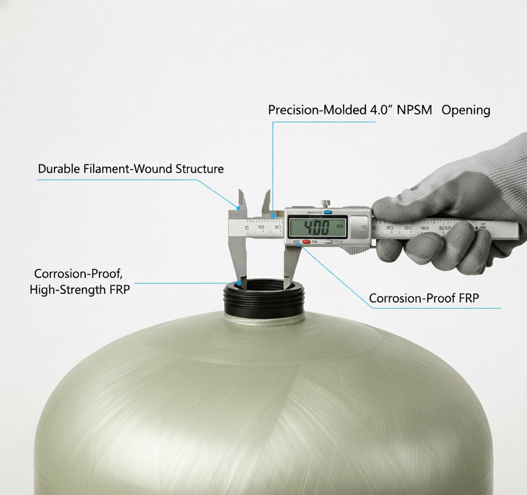 The 4″ NPSM top opening is a critical upgrade for commercial systems. By pairing with 1.5″ or 2″ control valves, this series minimizes pressure drop during service flow and ensures sufficient water velocity for backwashing. This is essential for heavy media beds (like Pyrolox or Greensand) that require vigorous expansion to prevent fouling, ensuring your system operates efficiently for years.Advantage TWO